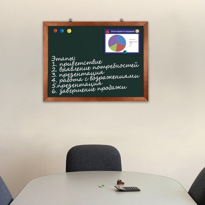 Рабочая поверхность изготовлена из металла с износостойким лаковым покрытием. Возможность крепления информации при помощи магнитов. Прочная деревянная рама.