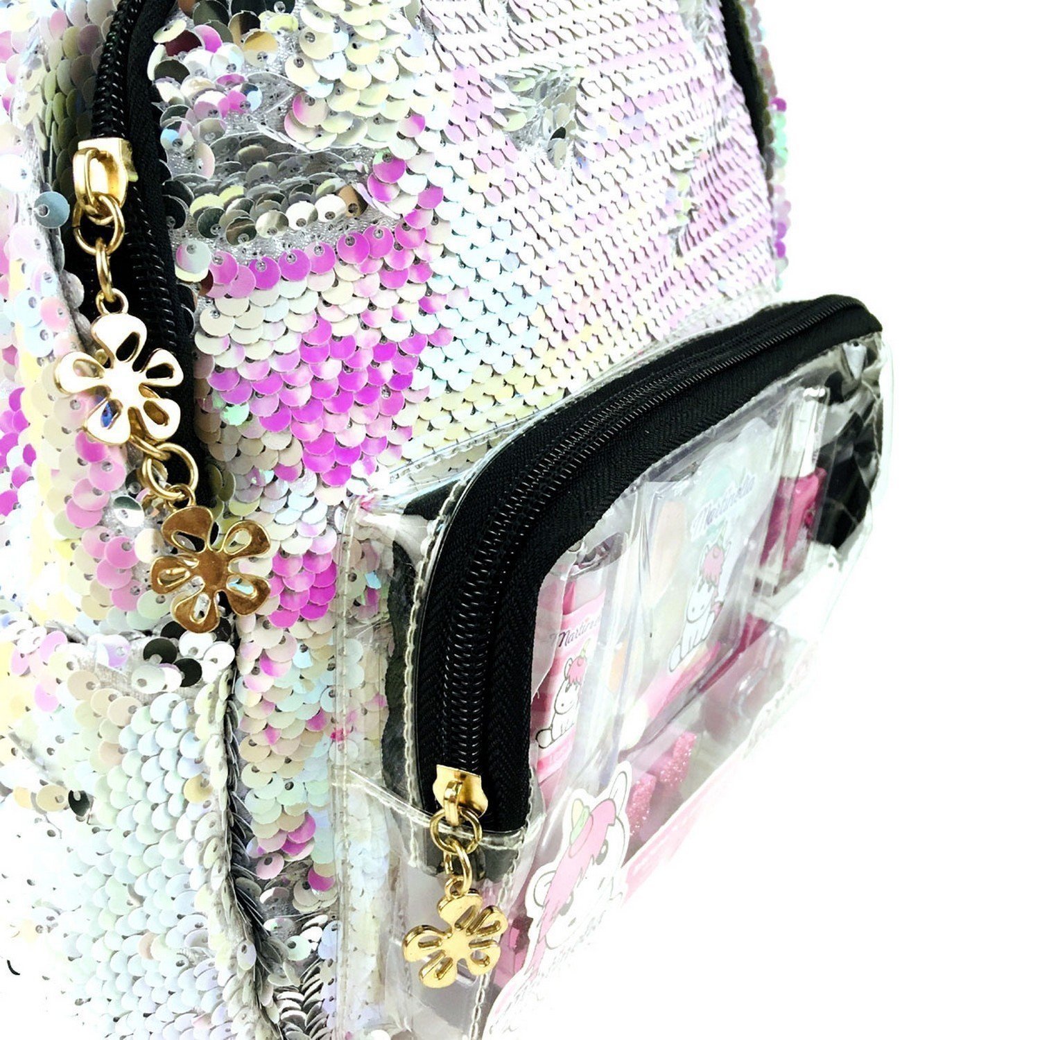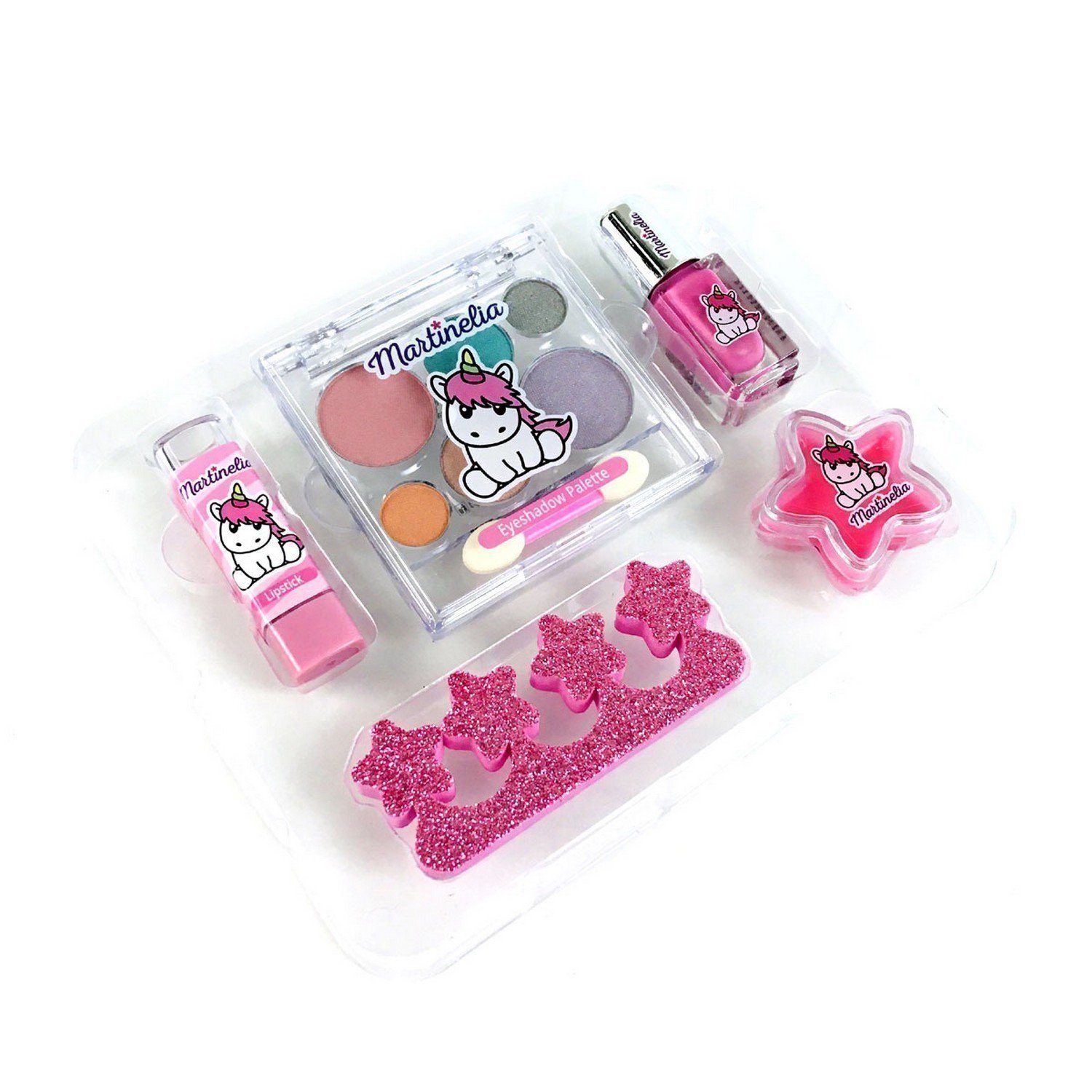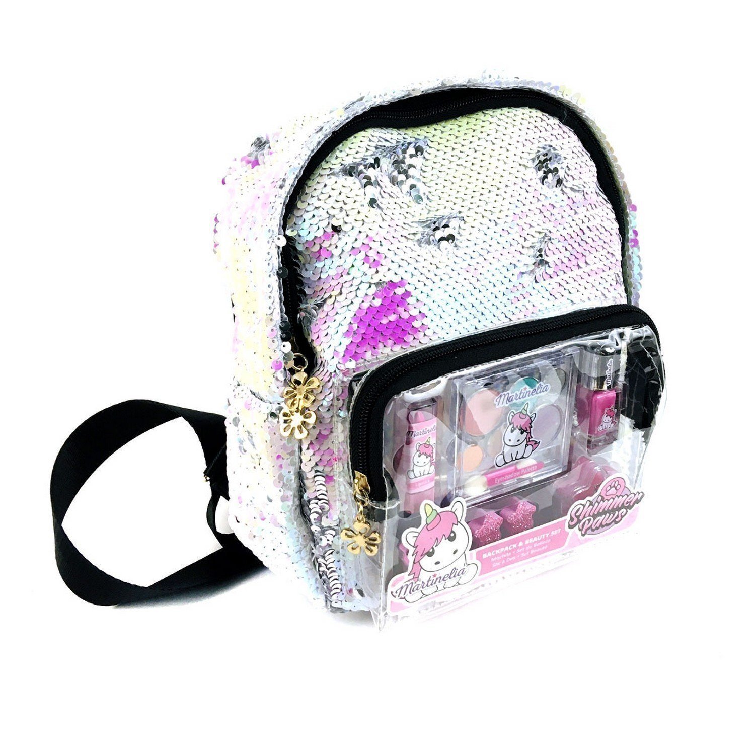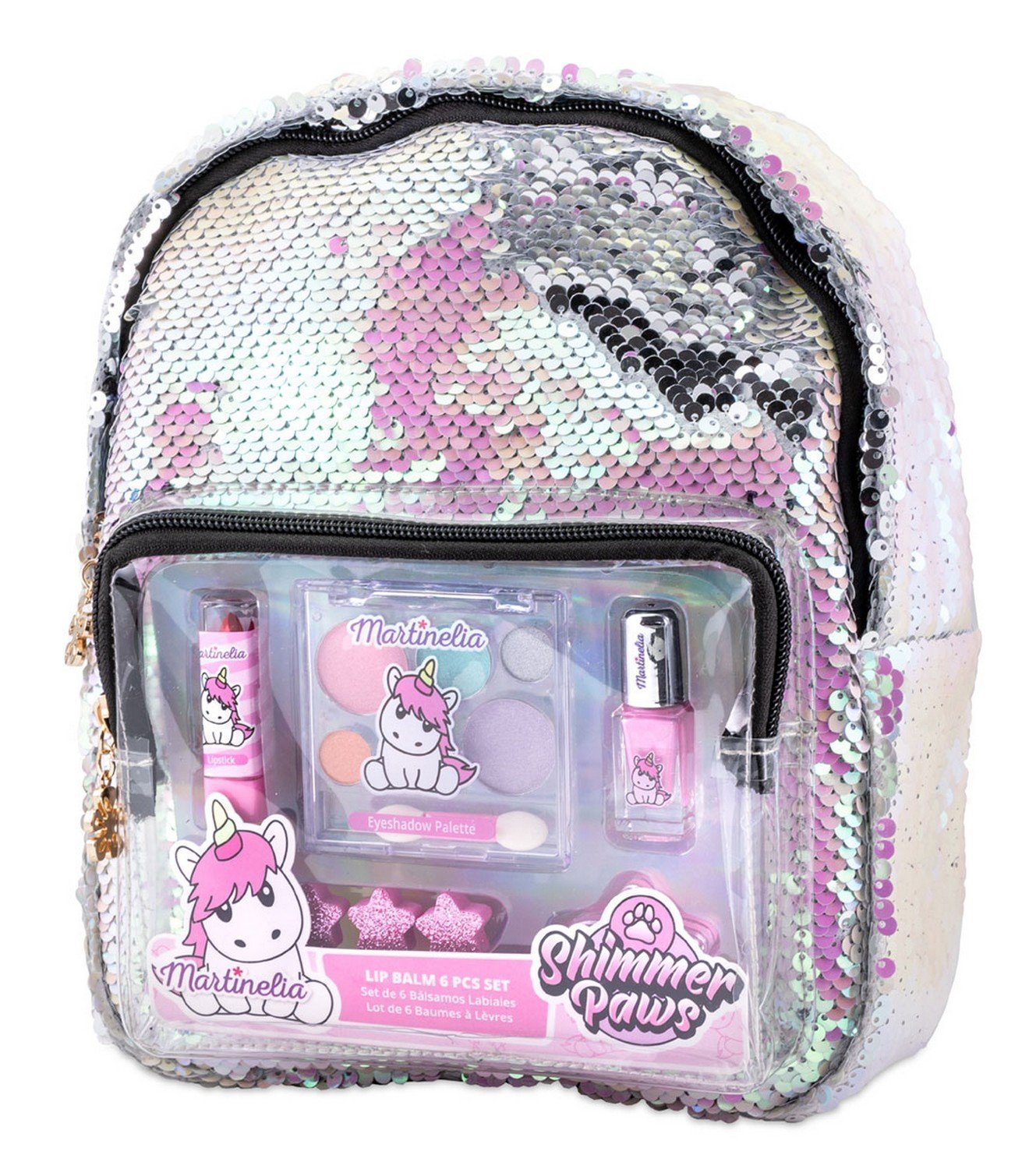 Набор детской косметики Martinelia упакован в блестящий рюкзачок, расшитый пайетками. Рюкзачок можно использовать как модный аксессуар на прогулках. Все предметы наборы украшены изображением сказочного Единорога.
