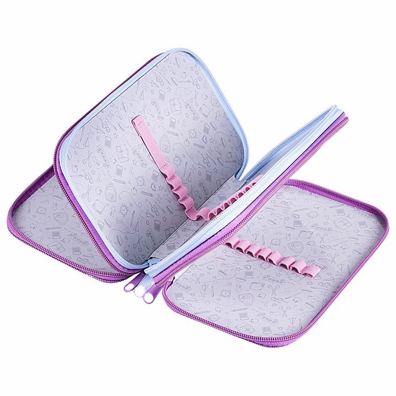 Пенал имеет 3 отделения, внутри на каждой створке имеются прочные резинки для канцелярских принадлежностей, внутренняя часть выполнена из картона с глянцевой ламинацией с узором.