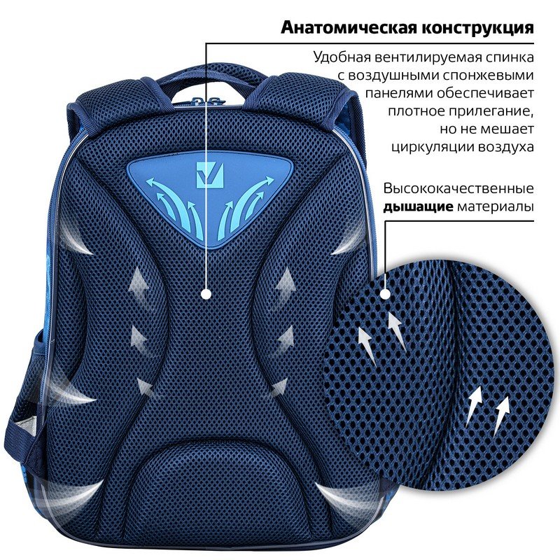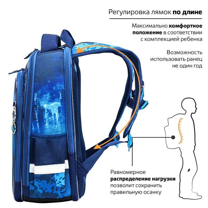 Удобная мягкая вентилируемая спинка с воздушными спонжевыми панелями разработана с учетом анатомических особенностей детей младшего школьного возраста. При правильной регулировке ранец будет практически не ощущаться на плечах и не будет доставлять дискомфорт при носке. В процессе эксплуатации равномерное распределение нагрузки позволит сохранить правильную осанку!