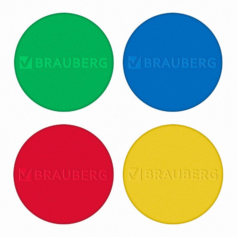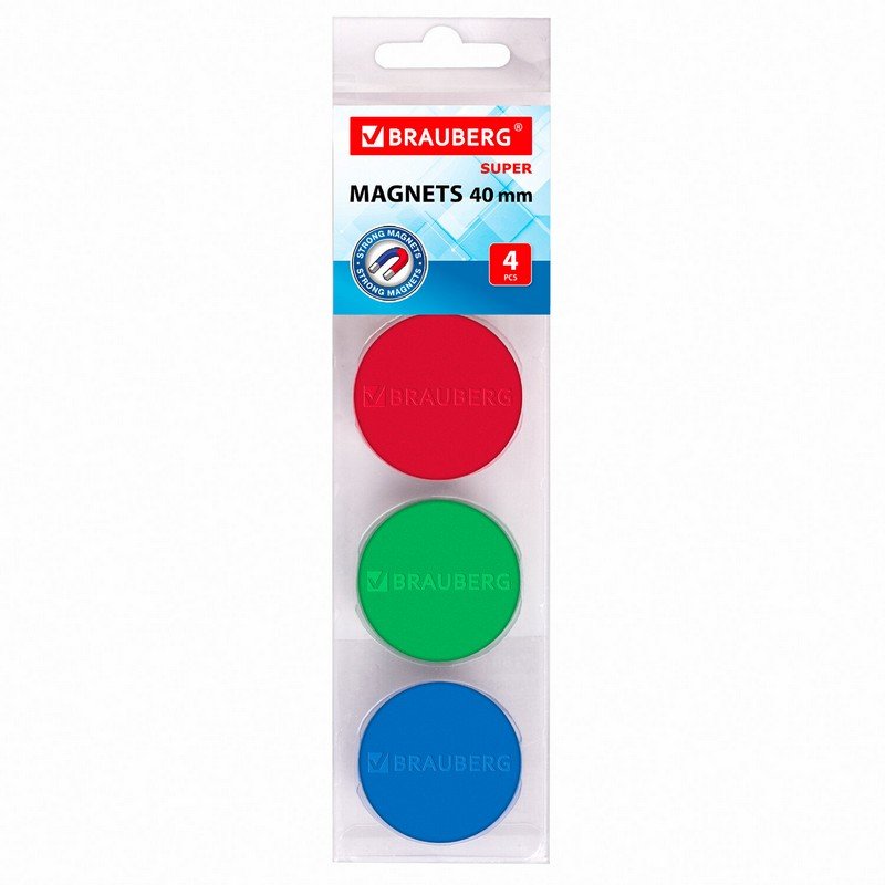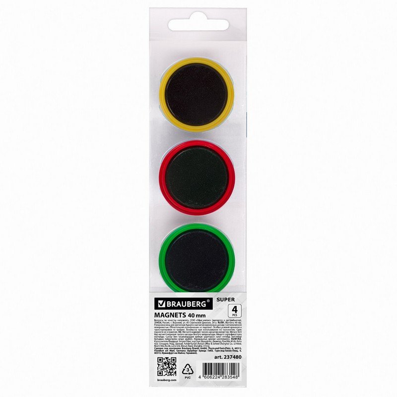 Диаметр магнитов составляет 40 мм. 4 штуки в комплекте. Надежно удерживаются на любой железной или стальной поверхности. Магниты BRAUBERG t;SUPERt; отличаются повышенной удерживающей магнитной силой. Магниты круглой формы выполнены из пластика цветов ассорти. Поставляются в прозрачном пластиковом боксе с европодвесом.