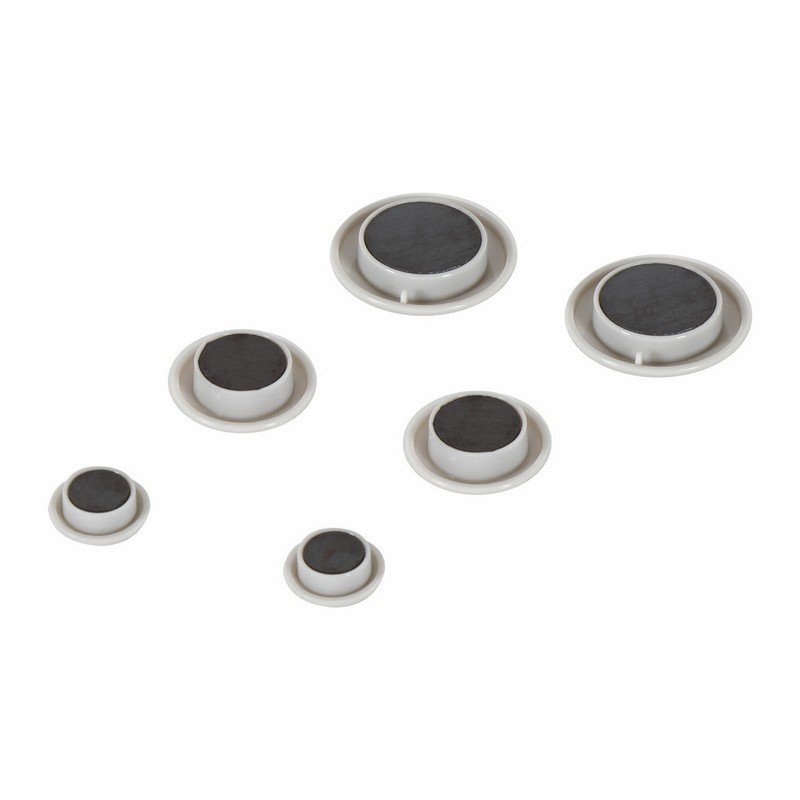 Диаметры магнита составляют 20 мм, 30 мм и 40 мм. 6 штук в комплекте. Надежно удерживаются на любой железной или стальной поверхности. Магниты круглой формы выполнены из пластика серого цвета. Поставляются в удобной блистерной упаковке с европодвесом.