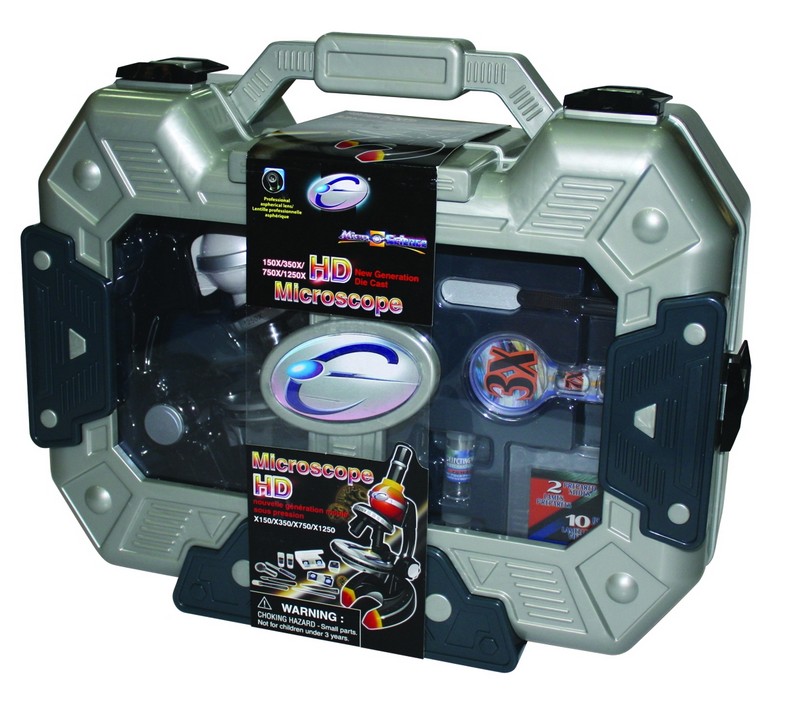 Такой микроскоп по достоинству оценит продвинутый юный биолог. Среди детских современных микроскопов он, пожалуй, самый мощный – имеет 4 световых фильтра с 150-, 350-, 750-, 1250-кратным увеличением. Для удобной работы ребенка предметный столик оборудован зажимами и регулируемым уровнем наклона поверхности. Микроскоп имеет дополнительную подсветку в виде осветительного зеркальца и встроенной светодиодной лампочки. В дополнение к микроскопу в набор входят: