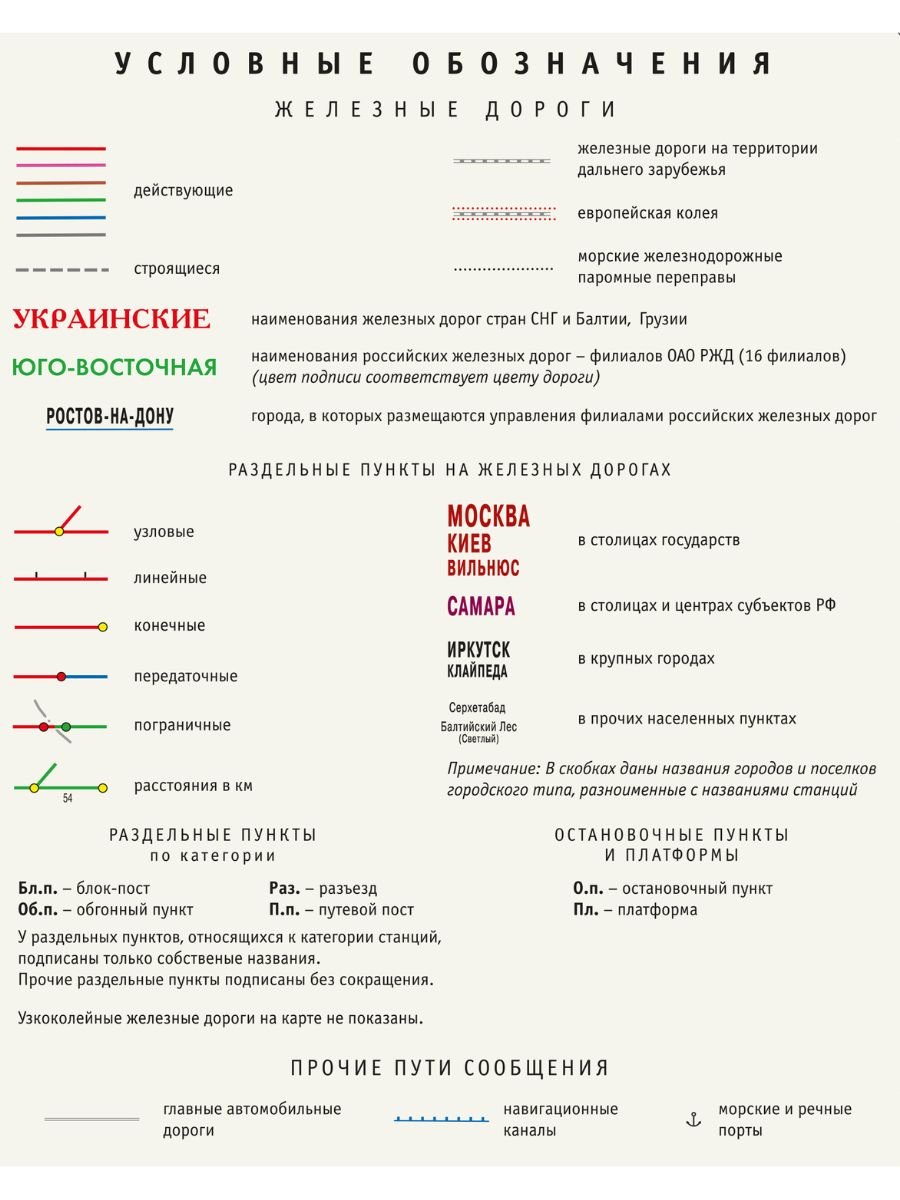 Самая актуальная карта железных дорог! Основное содержание: железные дороги (действующие и строящиеся), а также морские ж/д паромные переправы. На карте присутствуют крупномасштабные врезки по основным ж/д узлам.